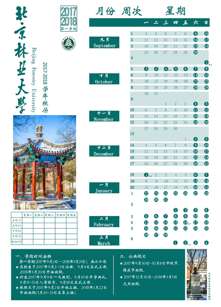 dota雷竞技报道 日前,2017-2018学年校历已向全校发布。2017-2018学年共设置39个教学周,第一学期20周,即2017年9月2日-2018年1月21日;第二学期19周,即2018年3月3日-7月15日。