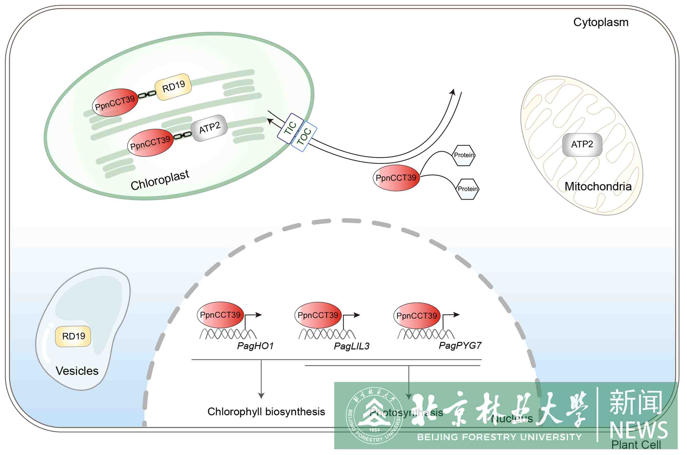 为了探究PpnCCT39的调控机制,利用RNA-seq和ChIP-seq关联分析,成功筛选出了PpnCCT39的下游调控靶基因。进而通过Y1H、Dual Luc及EMSA等实验手段,证明了PpnCCT39能够直接激活三个与叶绿素合成和光合作用密切相关的基因PagHO1、PagLIL3和PagPYG7的表达,从而促进它们的转录。并通过Y2H、Co IP、Pull Down及BiFC等实验,揭示了PpnCCT39能分别与定位于液泡和线粒体中的PagRD19和PagATP2蛋白发生相互作用,且这些互作均发生在叶绿体中。揭示了杨树中PpnCCT39调控叶绿素合成和光合作用,且在核质互作中发挥关键作用的分子机制(图2),为通过分子设计育种调控叶绿素合成、提升光合作用效率等提供了新的思路。