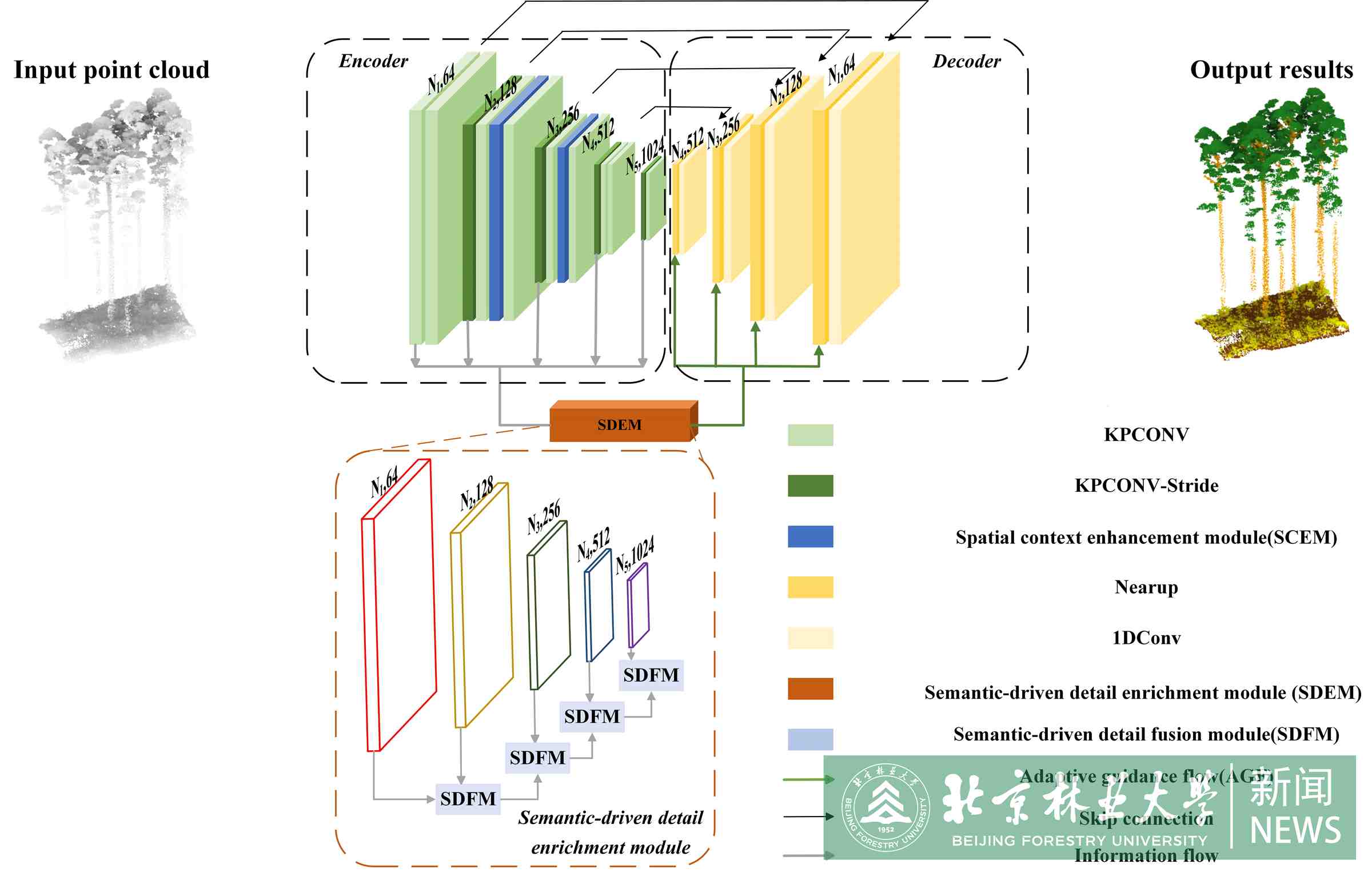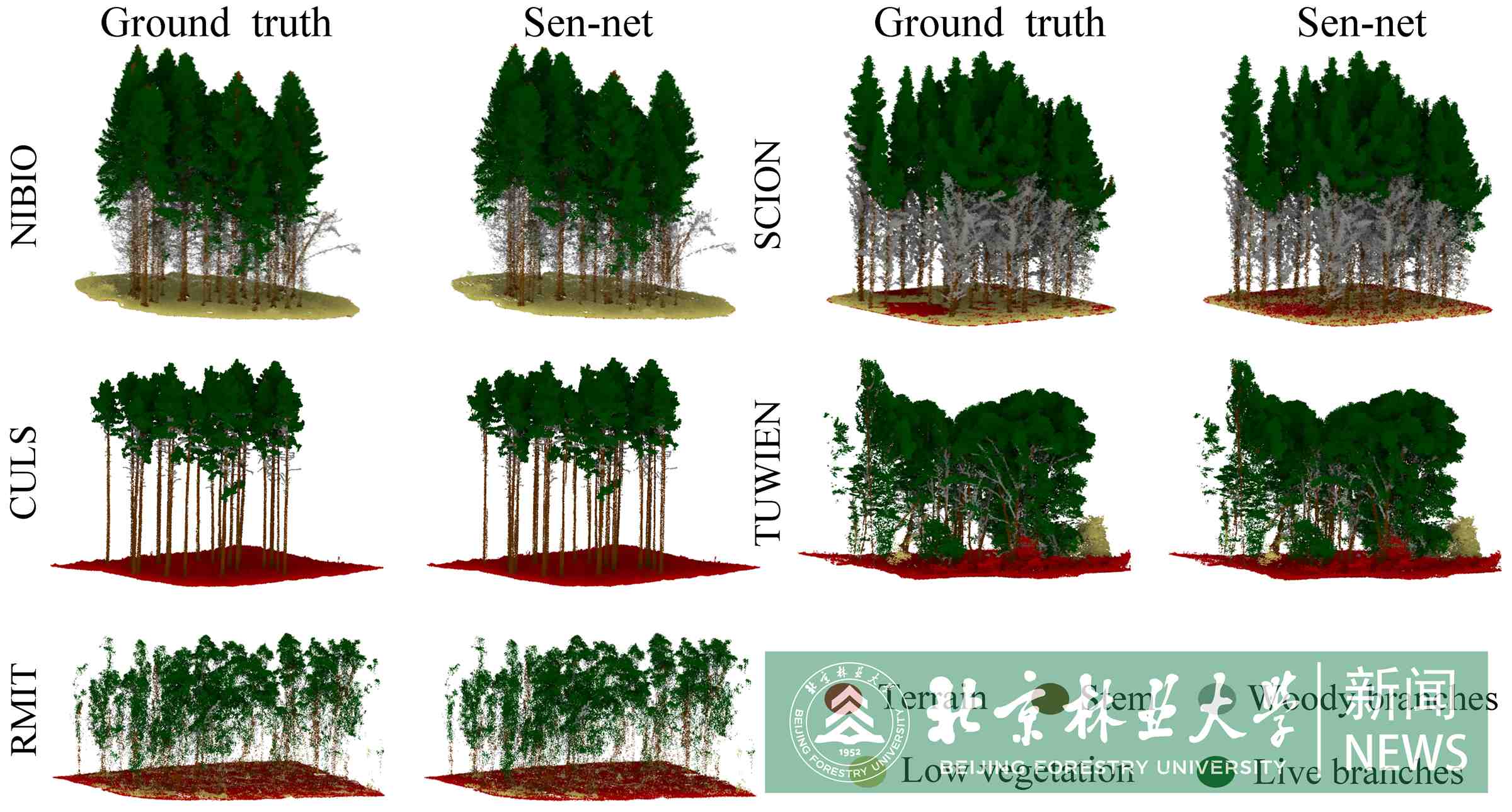 近期,信息学院(人工智能学院)卢昊副教授研究团队联合中国林业科学研究院、瑞士联邦森林、雪与景观研究所(WSL)等机构研究人员,在遥感领域顶刊《Remote Sensing of Environment》(中国科学院一区Top,IF=11.1)上发表题为"Towards a point cloud understanding framework for forest scene semantic segmentation across forest types and sensor platforms"的研究成果。该研究针对复杂森林场景,提出了大规模三维点云理解的神经网络模型Sen-net,实现了点云多种组分的高精度语义分割。