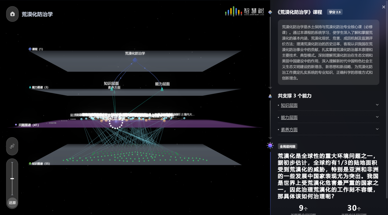 数智化赋能教育改革是当下高校教学改革的热点及重点,而知识图谱则是数字化转型的基础,对于探索新的教学模式和体系化成果建设具有重要意义。目前,“荒漠化防治学”课程知识图谱搭建了知识图谱、问题图谱和能力图谱三大知识构架,形成课程核心知识点55个、知识关系139对,对标知识点凝练教学问题41个,挂载教学资源244个。基于智能技术的结构化嵌入,形成课程数智化学习界面,可随时随地实现智能化的知识获取、知识应用和测验反馈等全过程自主学习。在基础知识的智能框架基础上,课程借助人工智能(AI)技术,实现了知识动态搜索、外部资源共享和前沿科技对标,拓展了课程内容、丰富了学生视野、提升了学生创新能力。未来,“荒漠化防治学”课程教学团队将以课程知识图谱为起点,进一步探索结合人工智能技术的教育教学改革,赋能拔尖创新人才培养。