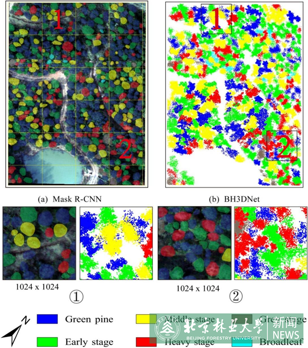 针对松材线虫病早期感病单木自动识别难的问题,研究团队开发了一种基于PointNet++网络架构的新型实例分割算法。该方法结合不同感病阶段松树和阔叶树的光学与三维特征,优化了编码器结构,以同步处理点云数据和光谱信息,实现了高郁闭度森林环境下的单木分割和不同感病阶段松树分类(图2),为松材线虫病精准监测和林业病虫害智慧化治理提供技术支持。相关成果以“A novel BH3DNet method for identifying pine wilt disease in Masson pine fusing UAS hyperspectral imagery and LiDAR data”为题发表在地球科学1区Top期刊《International Journal of Applied Earth Observation and Geoinformation》(IF=7.6)。