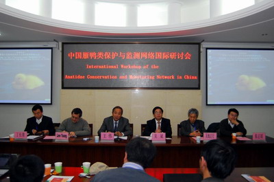 12月14日下午,“首届中国雁鸭保护与监测网络国际研讨会”在我校圆满落下帷幕。我校党委书记吴斌教授、国家林业局野生动植物保护司副司长王伟先生、东北亚雁鸭类网络工作组主席吴地正行教授、湿地公约秘书处亚太地区高级代表Lew Young先生、中国鸟类学会秘书长张正旺教授出席了会议。