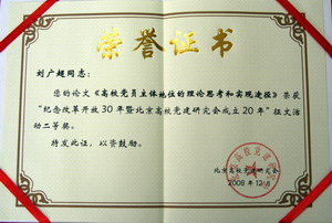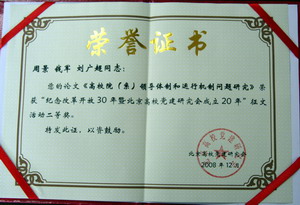 12月25日,北京高校党建研究会成立20年纪念大会暨2008年年会召开。会议表彰了“纪念改革开放30年暨北京高校党建研究会成立20年征文活动”的获奖个人和单位,向研究会五位前任会长颁发了特别贡献奖。我校共获得了两个二等奖和一个三等奖,并被评为优秀组织奖。