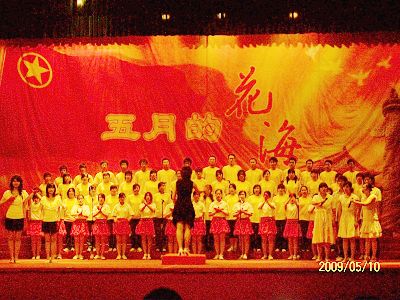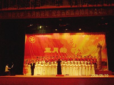 乘着国庆60周年和五四运动90周年的契机,5月10日晚七点,田家炳体育馆内举行了“五月的花海”合唱复赛比赛,又值“5·12”地震一周年纪念日临近,合唱比赛的气氛凸显了这三大主题。