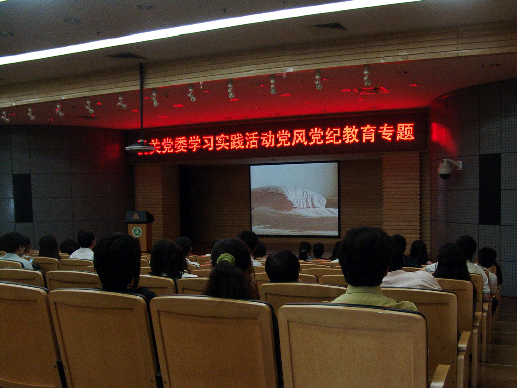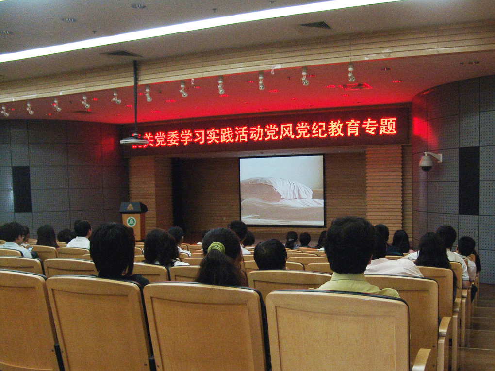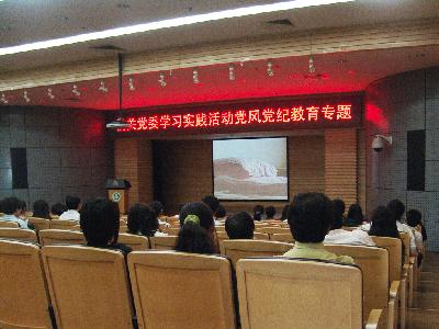 根据机关党委学习实践科学发展观活动分析检查阶段实施方案的安排,5月15日,机关党委在图书馆五层报告厅开展了党风党纪专题教育,与会人员观看了两部专题录像片《一个明星区长的堕落轨迹––周良洛受贿案警示录》和《校园警示录》。机关党委书记主持学习会,机关广大党员参加了学习。