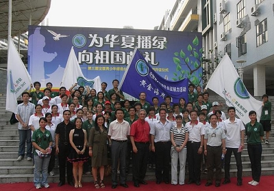 与会领导来宾在开幕式上分别向北京林业大学、华南农业大学、广东海洋大学、厦门大学的绿色长征志愿者授予黄金海岸团总团、分团旗帜,并且为京外3所高校赠送了《绿色长征丛书》。