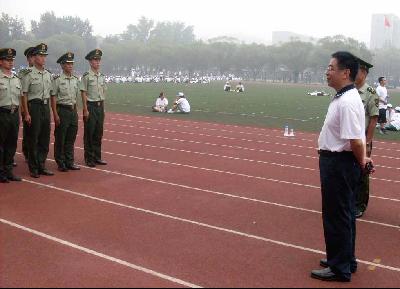 7月29日上午,校党委书记吴斌教授来到学校操场,亲切看望正在进行首都国庆60周年群众游行训练的师生,慰问训练军事教官。
