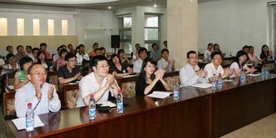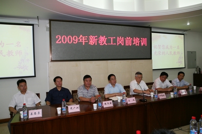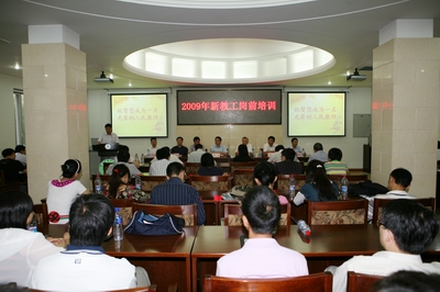 9月4日上午,校人事处组织2009年新教工参加岗前培训,培训分迎新仪式、校情校史介绍、管理政策讲解、新老教师座谈四个部分展开,培训对象是09年来校报道的80名新教工。