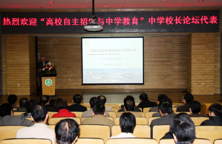 据悉,高校自主招生越来越受到广大学生、家长、学校和全社会的关注,北京林业大学、北京交通大学、北京科技大学、北京邮电大学、北京化工大学作为北京实行高校自主招生“五校联考”的高校,正不断探讨高校选拔人才与中学教育的深层次接轨,为加深高校与中学之间的沟通和联系,五校于2009年10月30日、31日在北京联合举办全国重点中学校长论坛。论坛以“高校自主招生与中学教育”为主题,邀请了教育部有关领导作主题报告,部分中学校长作了主题发言,采取大学与中学互动的形式,通过到高校实地考察并与高校领导交流,了解各高校办学理念和人才培养特色,深入研讨高校招生与中学教育的融合、尤其是高校自主招生与中学教育的衔接等热点议题。(A21)